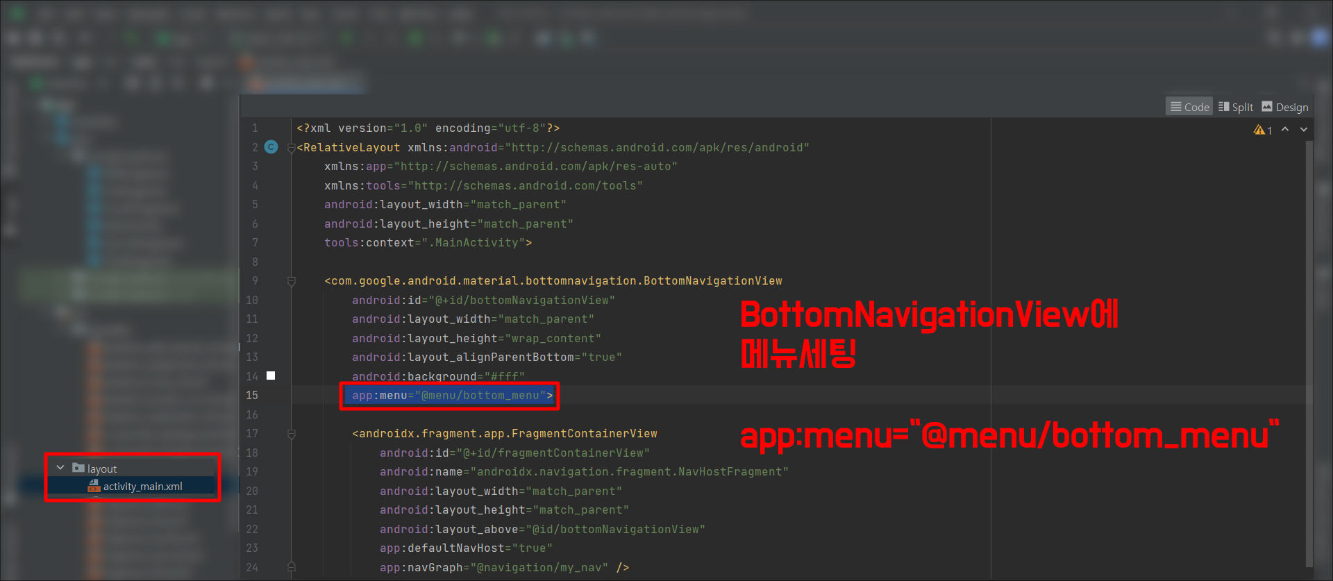 activity_main Code모드에서 BottomNavigation에서 메뉴를 세팅한다.