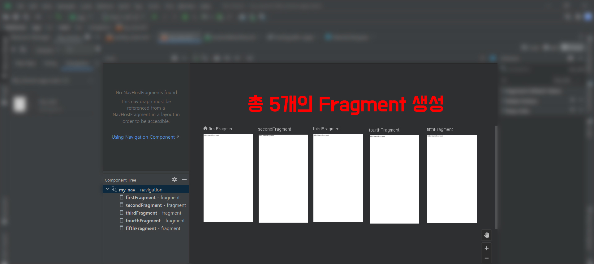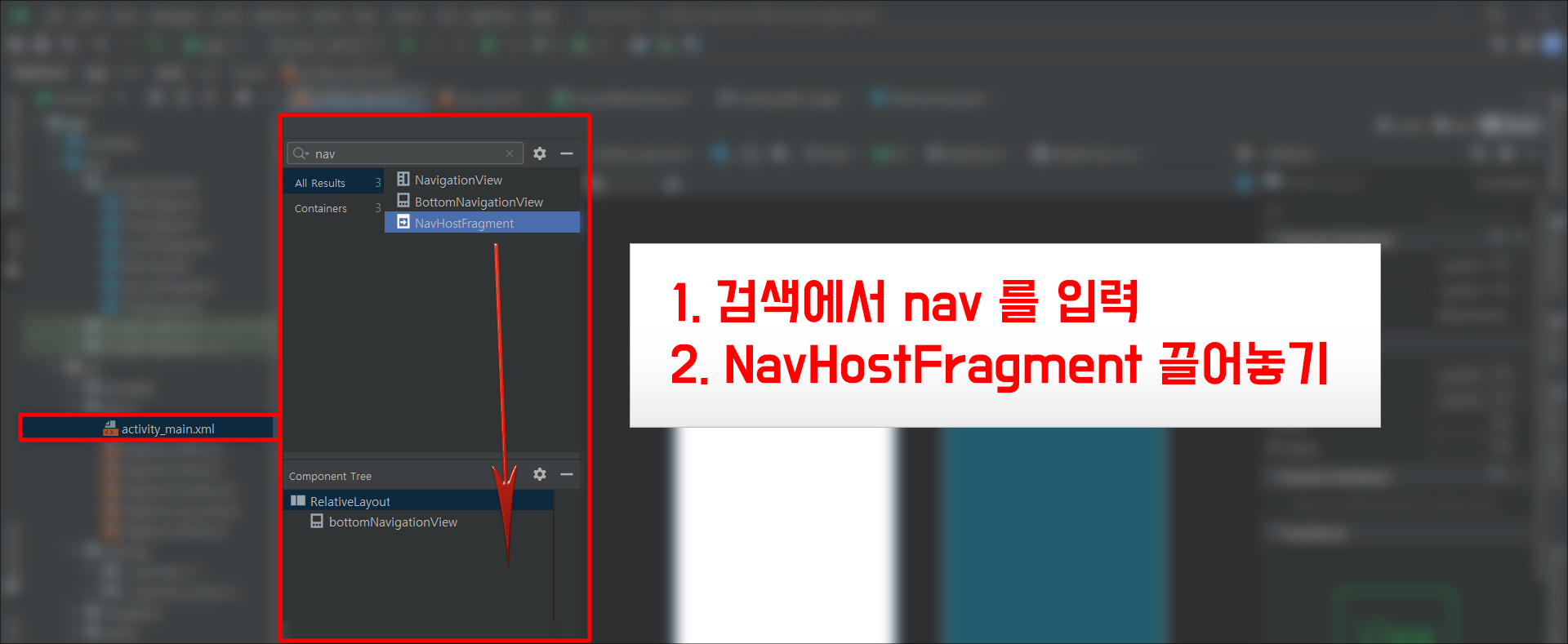 layout의 activity_main에서 Design으로 진입해서 NavHostFragment를 끌어놓는다.