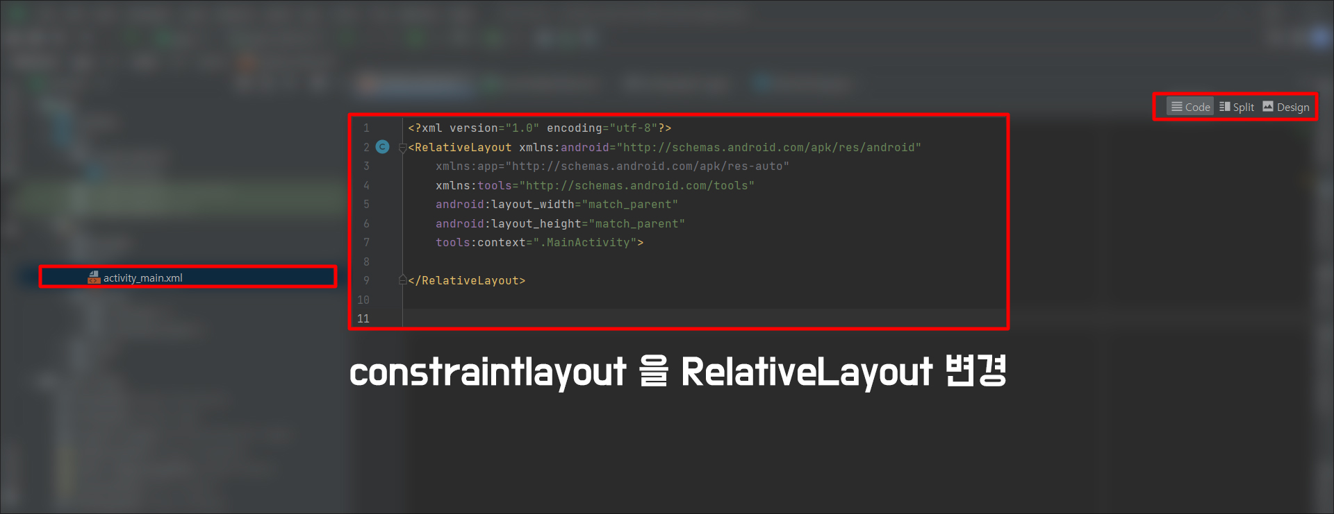 layout의 activity_main에서 Code로 진입하여 constraintlayout을 RelativeLayout 으로 변경 하여 준다.