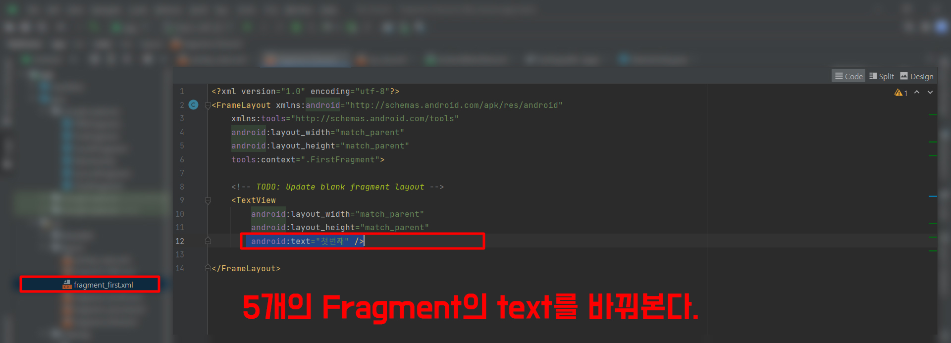 각각의 fragment xml파일에서 Fragment의 text이름을 변경해준다.