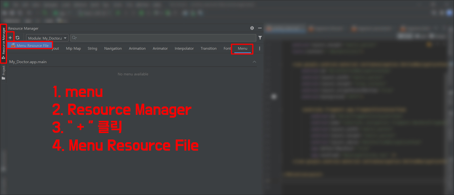 Resource Manager에서 Menu -> " + " 버튼을 클릭하여 Menu Resource File 눌러준다.