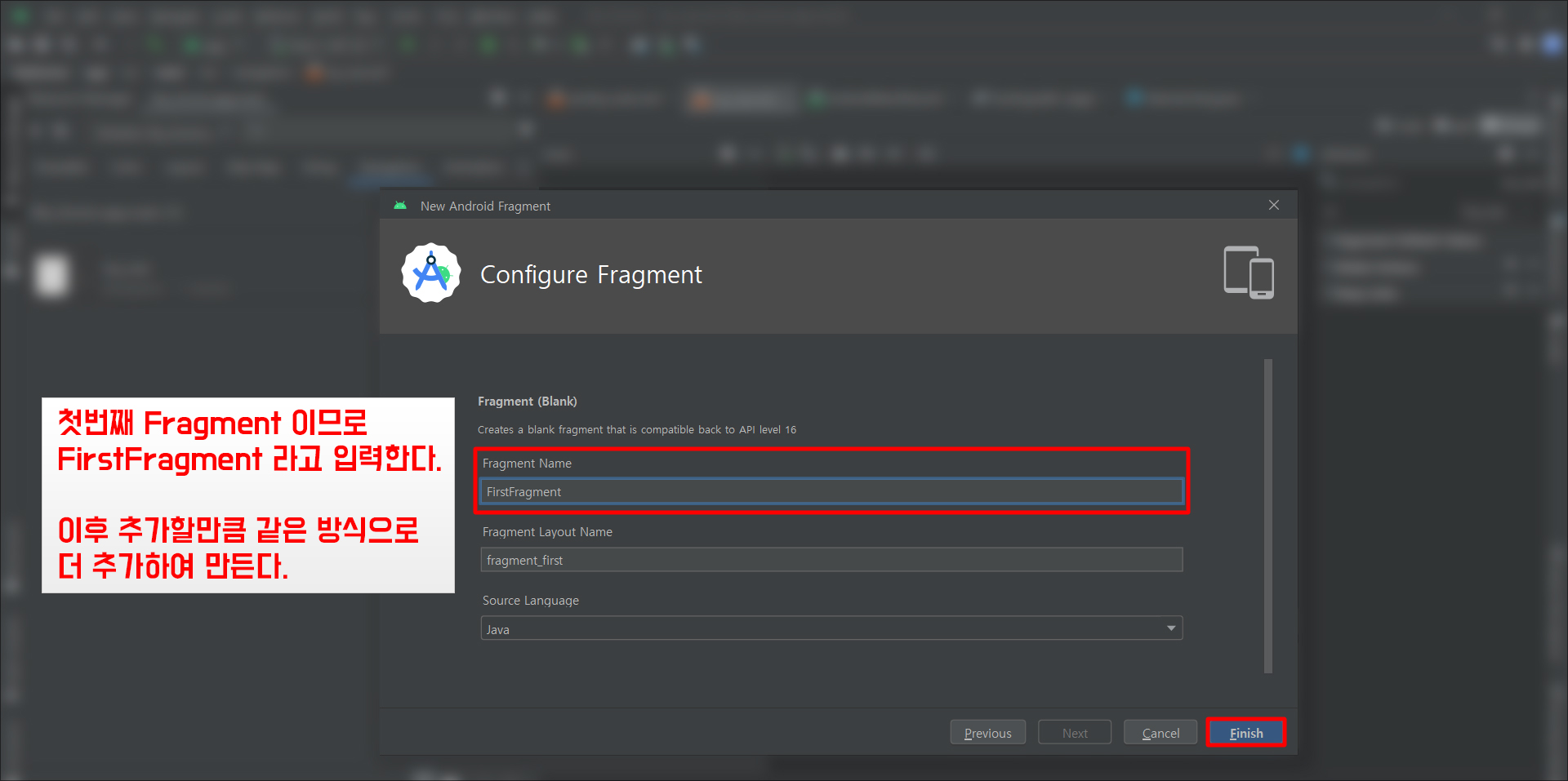 Fragement Name를 지어주고 Finish를 클릭한다.