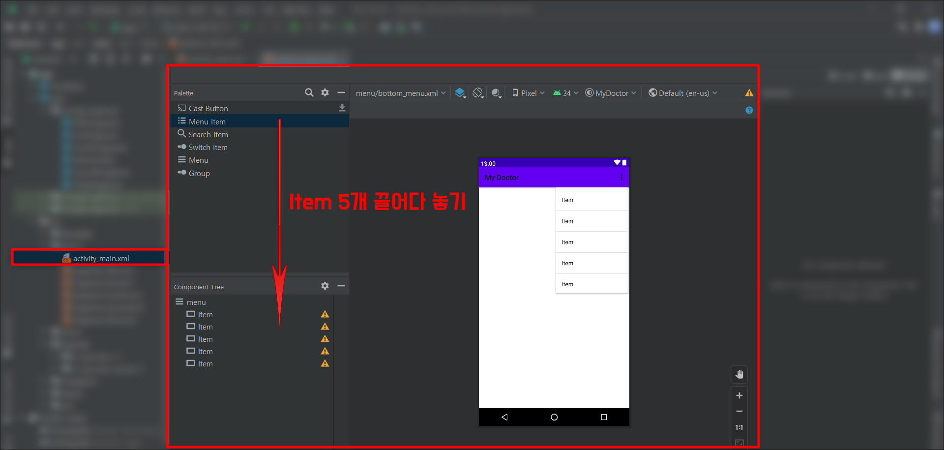 activity_main Design모드에서 플러그먼트와 같은 수의 Menu Item을 끌어다 놓는다. 현재 실습예제에는 5개의 Fragment를 만들었으므로 5개의 Item을 가지고 온다.