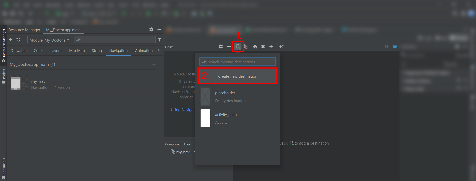 Create new destination를 눌러서 원하는 개수의 Fragment만큼 생성해 준다.