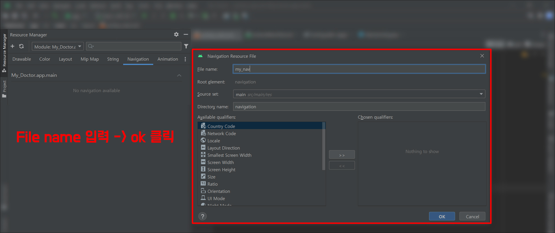 팝업창이 뜨면 File name를 입력한다. 필자는 배운대로 my_nav라고 입력하였다.