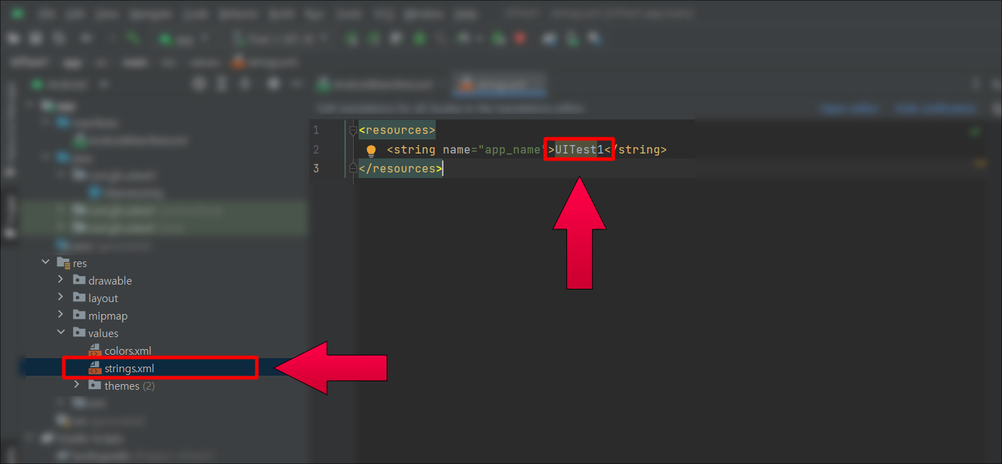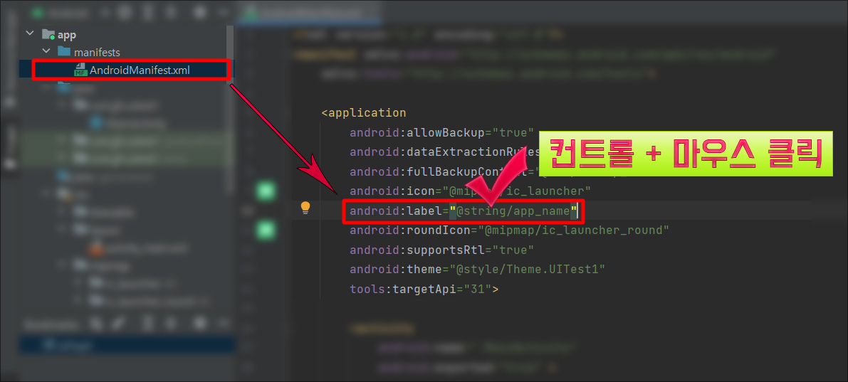 AndroidManifest.xml 진입 => applicatiion => android:label="@string/app_name" 에서 "@string/app_name" 를 컨트롤 키를 누른 상태에서 마우스로 클릭한다.