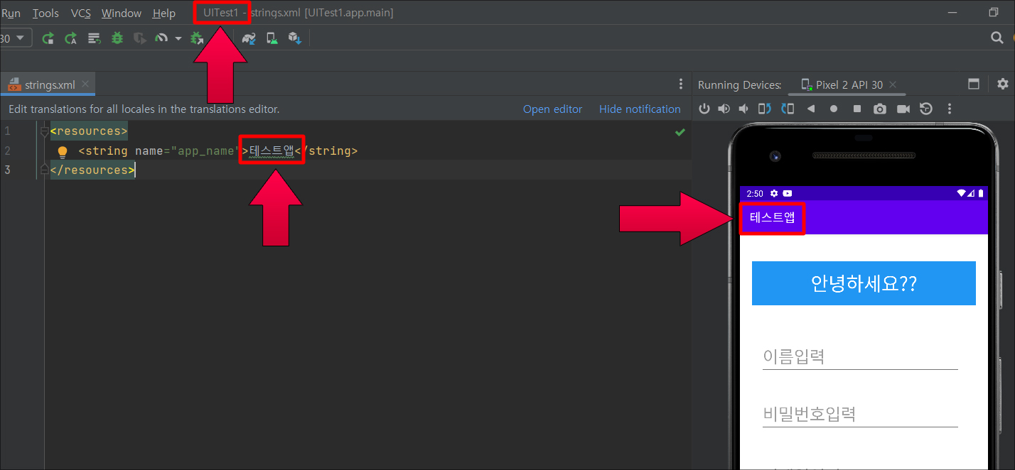 또는 res => values => string.xml 로 진입하여도 안드로이드 스튜디오 앱이름을 바꿀 수 있다.