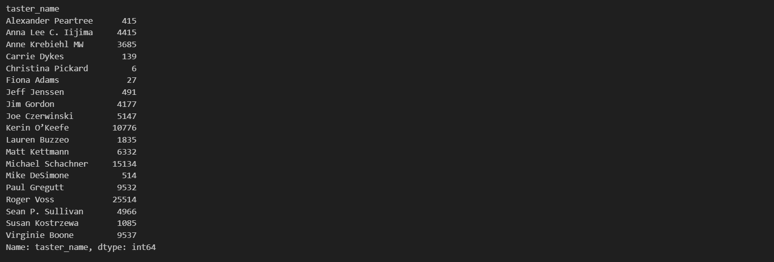 #reviews2.groupby('taster_name') 별로 ['taster_name'].count() 카운트 해라