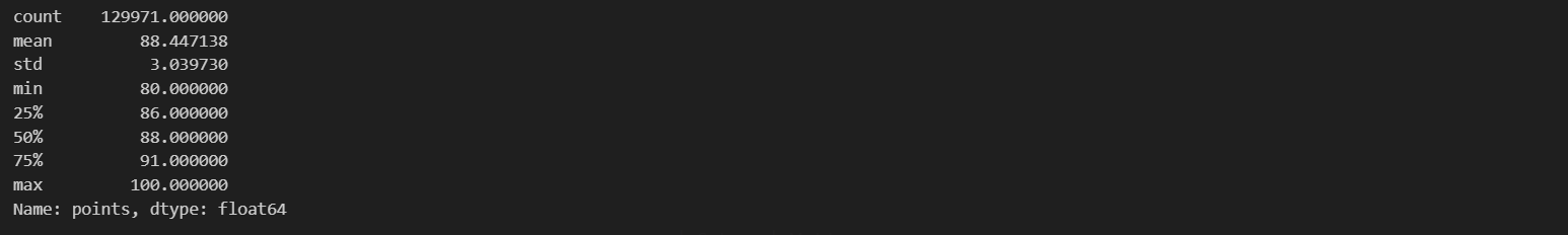 - 리뷰의 포인트의 평균을 구하고, 리뷰의 포인트값이, 평균보다 큰 데이터 (즉, 평가가 좋은 와인) 만 가져오시오.