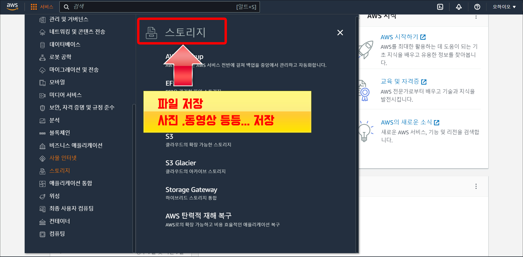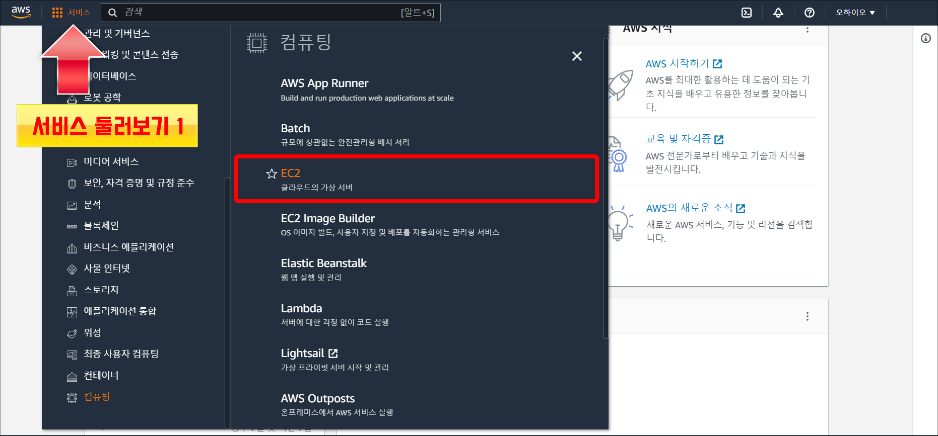 홈페이지 상단 우측 끝에쯤을 살펴보면 리전이 보인다. 처음 로그인을 해서 보니 리전이 미국동부 "오하이오"로 되어있다. 필자는 한국에서 접속을 하기 때문에 원활한 작업을 하기 위해 리전의 위치를 "서울"로 바꿔주었다.