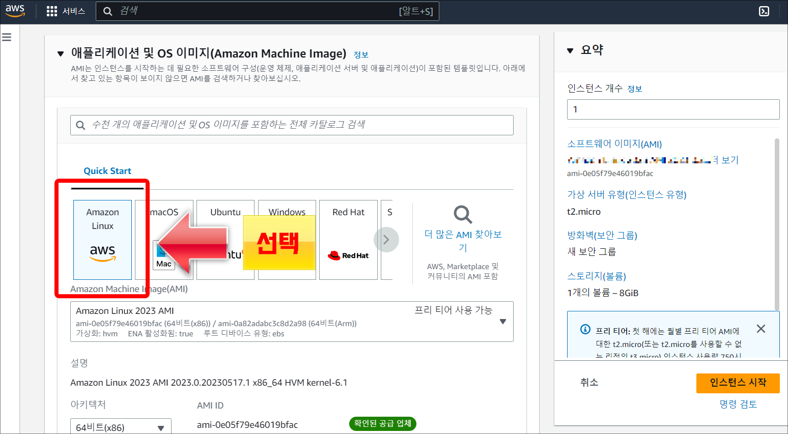 필자는 Amazon Linux에서 2023 AMI를 선택하였다. "프리 티어 사용 가능"이다.