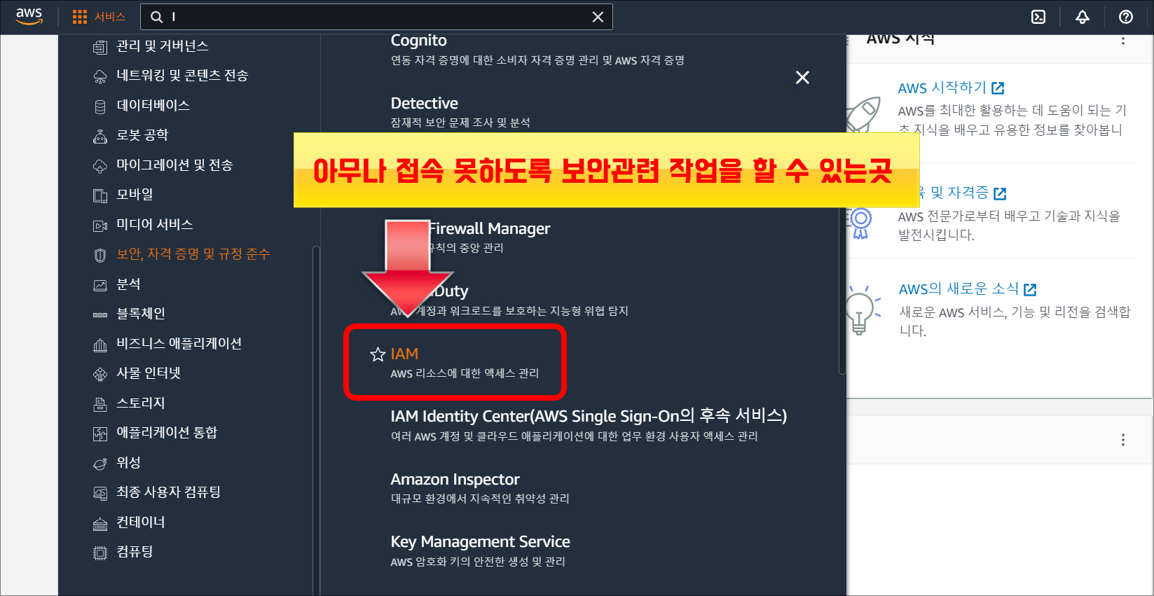 - IAM : AWS 리소스에 대한 액세스 관리 ( 아무나 접속 못하도록 보안 관련 작업을 할 수 있는 곳 )
