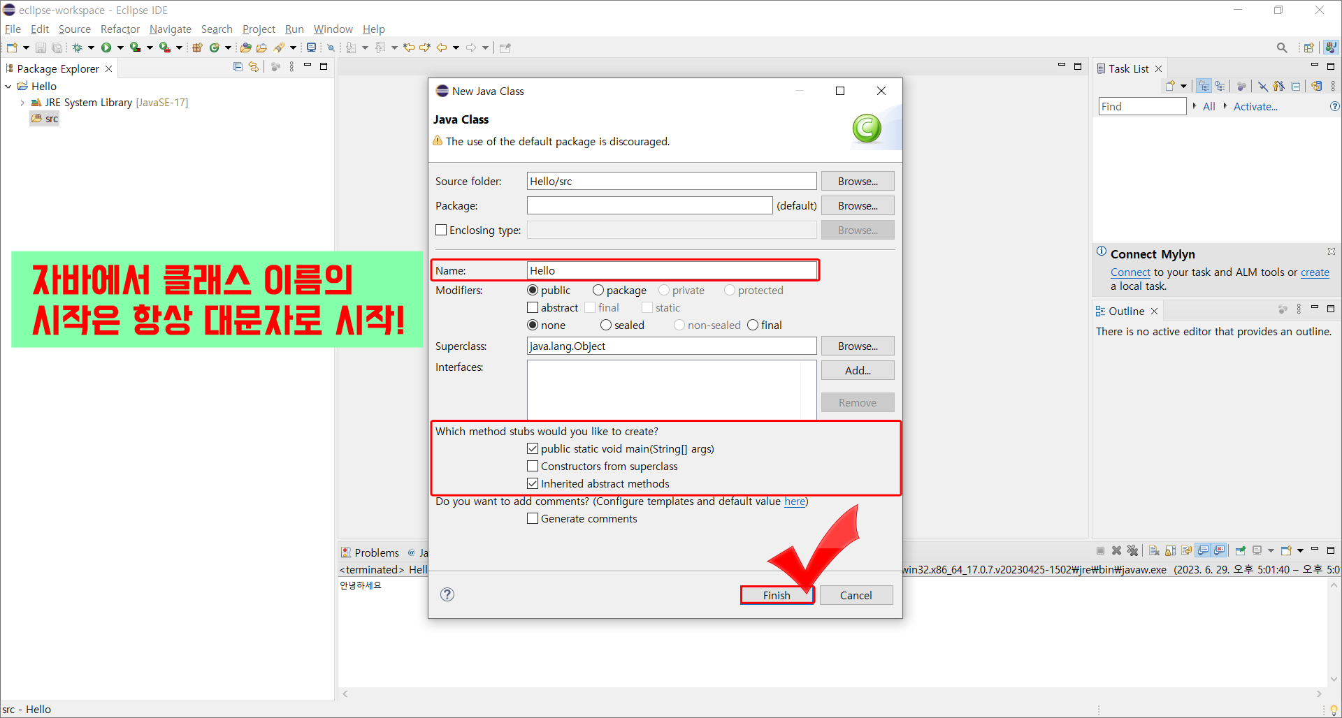 public static void main(string[] args) 를 체크하여 "메인메소드"를 생성해 준다.