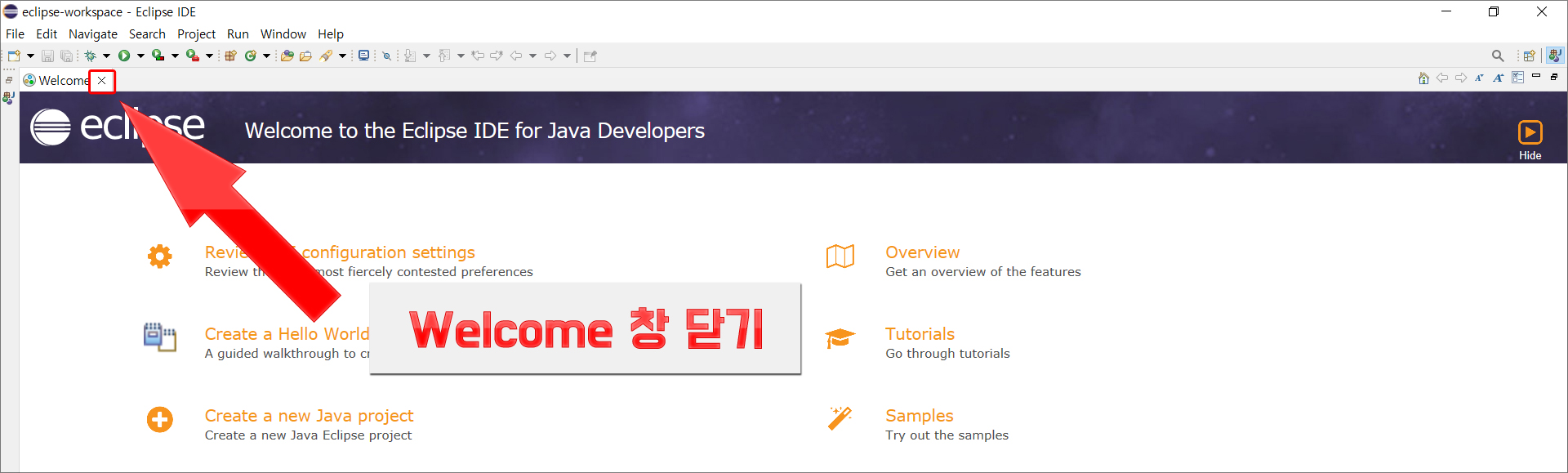 인스톨 과정이 끝나면 자동으로 이클립스 프로그램이 실행 되고, 첫 화면에 Wlcome창이 뜬다. 내용한번 확인해보고, 닫으면 된다.