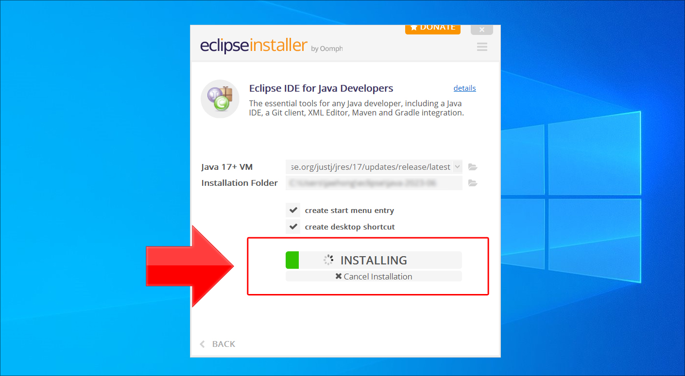프로그램을 실행시키면 eclipse installer이 실행된다. 여기서 "INSTALL"버튼 클릭!