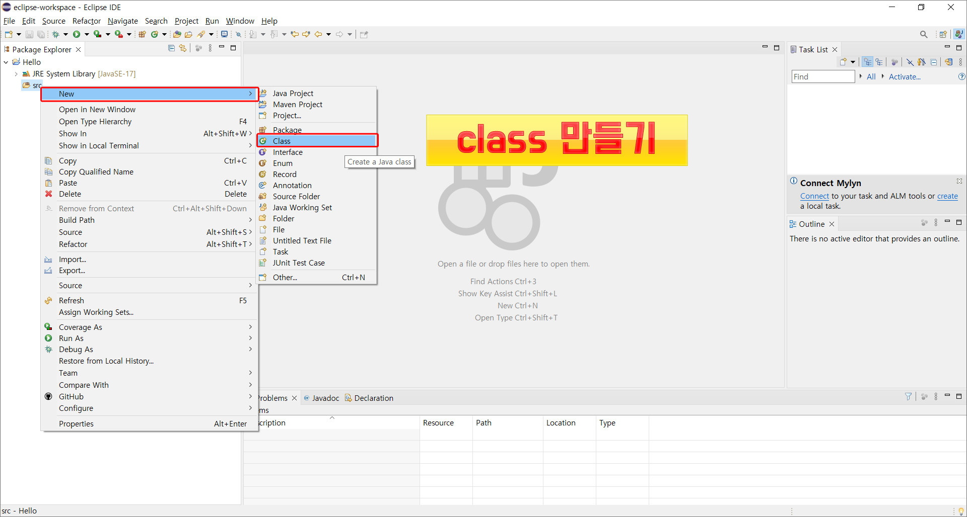 Hello 라는 프로젝트가 만들어졌다면, 화면 왼쪽 Package Explorer에서 Hello 프로젝트 하위에 scr폴더 마우스 우클릭을 하고, "New" -> "class" 클릭하여 test를 위한 class를 만들어 준다.