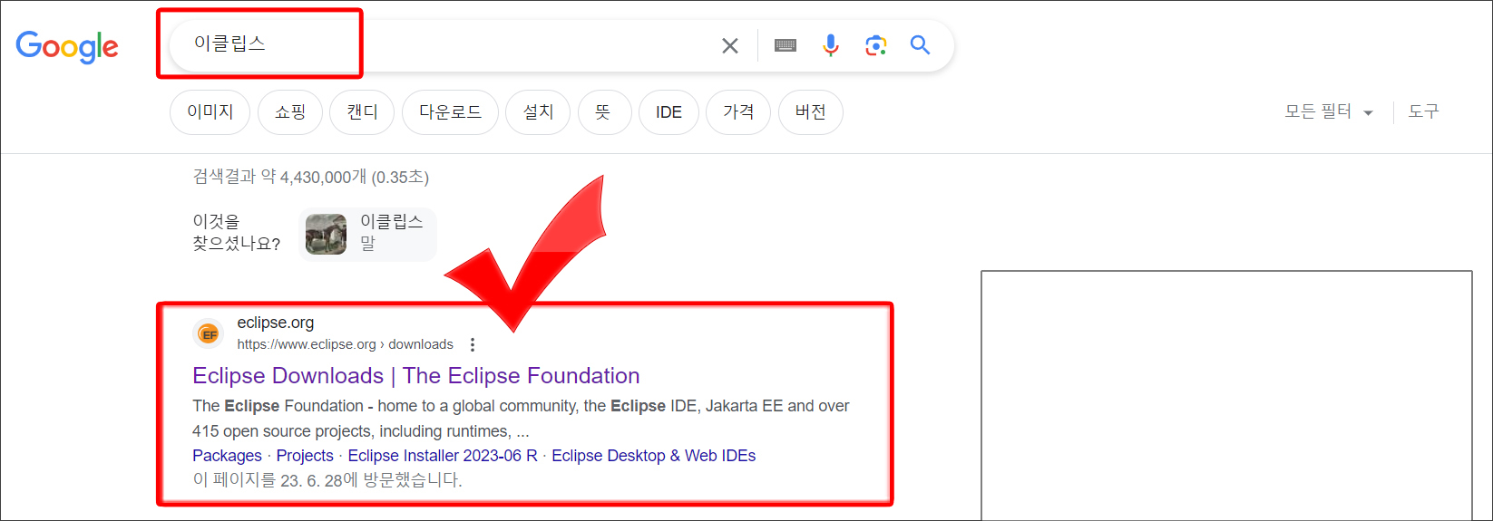 포털에서 "이클립스"를 검색하면 되는데 필자는 Google에서 검색하였다. 제일 처음에 나오는 Eclipse 사이트를 클릭하여 진입하면 다운로드 받을 수 있다.