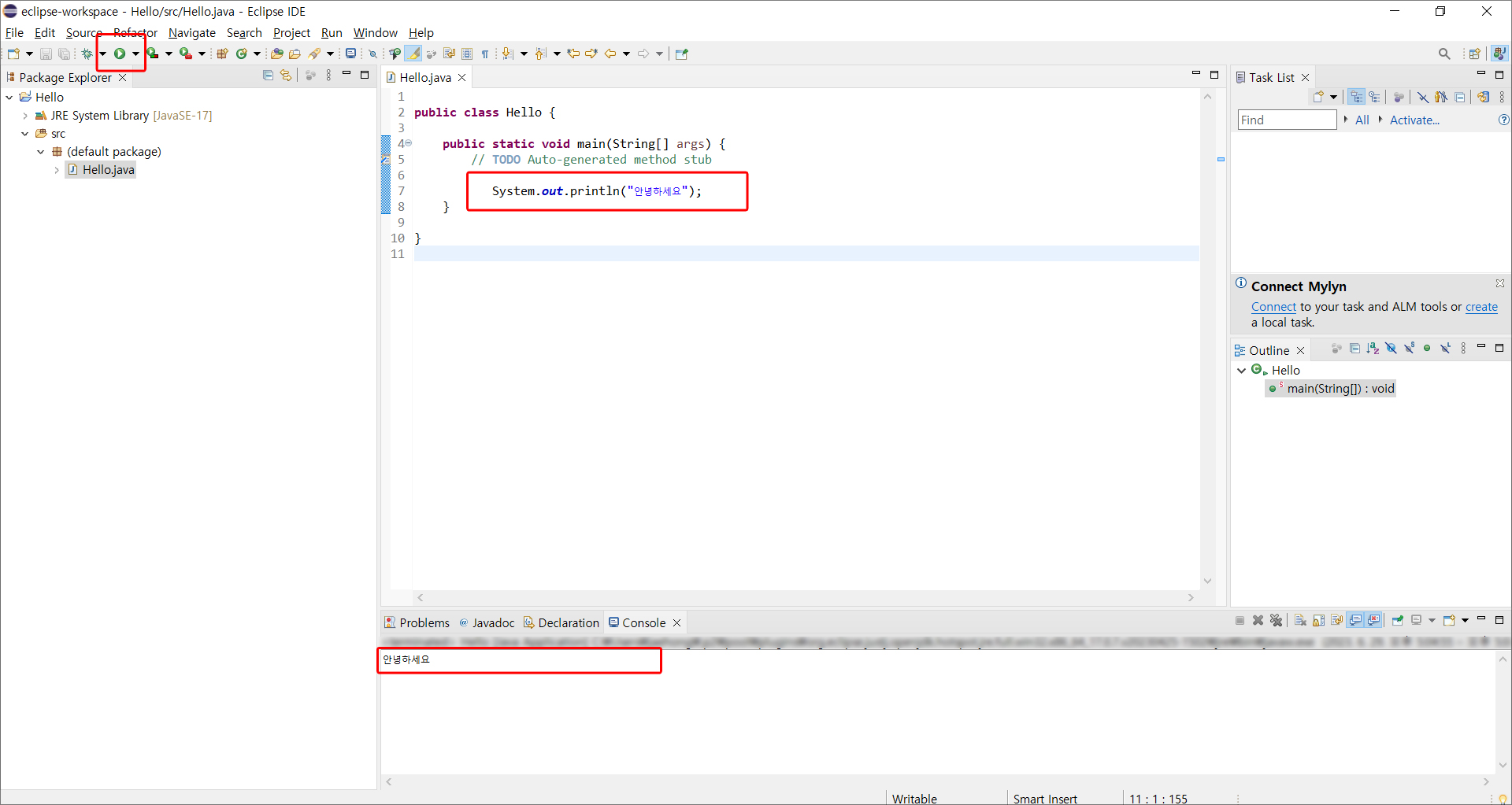 메인메소드 사이에 System.out.println("안녕하세요"); 를 입력하고 Run 버튼 또는 F11을 클릭하여 실행을 시켜 보자!